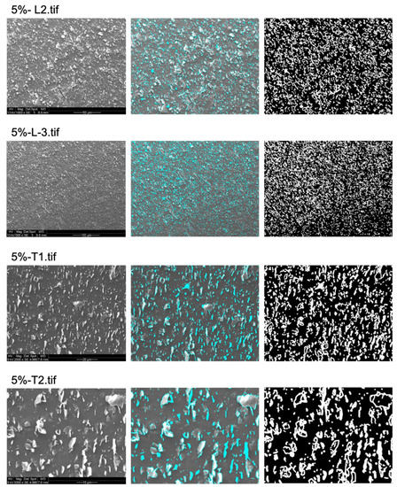 As we previously investigated [7], the ratio of graphite nanoplatelets to total surface was significantly different among longitudinally (L) and transversally (T) sliced samples with ≥15% integrated graphite nanoplatelets. The ratio of graphite nanoplatelets to total surface was significantly higher in longitudinally (L) sliced samples compared to transversally (T) sliced samples with the same density of graphite nanoplatelets used for fabrication. Subsequently, there was an clear difference in loss of Staphylococcus epidermidis viability among these samples, as longitudinally (L) sliced polymers with ≥15% graphite nanoplatelets showed higher loss of viability compared to the transversally (T) sliced samples. Thus, the increased ratio of graphite nanoplatelets to total surface in longitudinally (L) sliced polymers could result in increased loss of viability. Interestingly, these results were clearly reflected by our prediction and, as it was shown (Table 1), the average predicted bacterial exclusion of 15%-L images was 89.86% ± 2.91%, which was significantly higher than that of 15%-T images (73.85% ± 6.84%).
