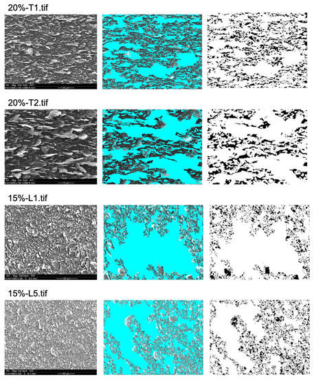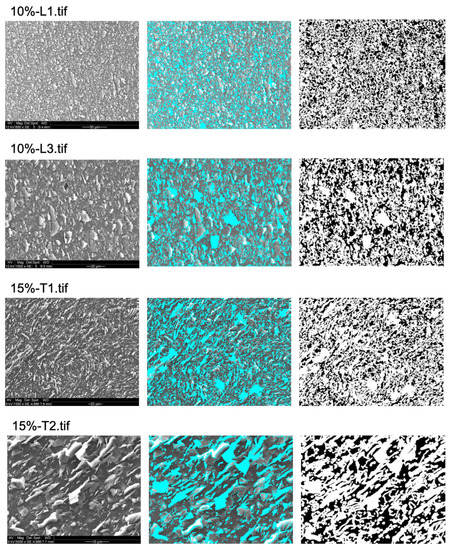 The source pictures for the analysis were obtained by means of SEM at the fixed settings. Due to different surface topology and conductivity (due to different conductive filler dispersion), the pictures had different values of contrast and brightness. All source pictures were provided in 8-bit pixel form (values ranging from 0 to 255).