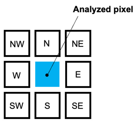 1. Graphene edge detection. This procedure searches for the “sharp” contrast area in the image. Pixel intensities, I, of surrounding pixels were obtained and the absolute intensity difference of pixels positioned opposite from each other with respect to the analyzed pixel was averaged as shown in Figure 7. Value ranging from 0 to 255 was obtained for each pixel, which represents the “absolute” gradient of the intensity of the image and is denoted as C further on: