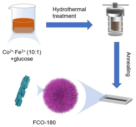 Finally, the above samples were obtained, and then they were heated for 1 h at 500 °C in a muffle furnace. The FCO materials with different morphologies were gathered after cooling to room temperature.