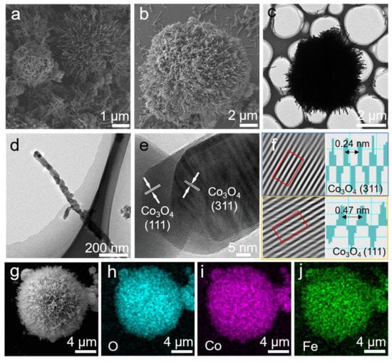 The preparation route of FCO-180 was detailly illustrated in Figure 1. FCO with different temperatures of hydrothermal reaction was prepared as a reference. Observing from SEM images (Figure 2a,b and Figure S1), the sea urchinlike structure was well maintained only for FCO-180. FCO-180 presents regular sphericity with a uniform diameter of 5–13 μm. This morphology was also detected from the TEM (Figure 2c). Moreover, the shape of the FCO-180 sample is sea urchinlike, which could provide more of the specific surface area. In Figure 2d, each Fe atom has a size of about 20–30 nm, and Fe atoms are dispersed homogeneously in Co3O4. As shown in Figure 2e,f (the high-resolution (HR)TEM), there are two evident crystal lattice fringe distances indexed to the (311) and (111) plane of Co3O4, respectively. The EDS mapping of FCO-180 spheres further confirmed the uniform distribution of O, Co, and Fe (Figure 2g–j) in the formed sea urchinlike structure.