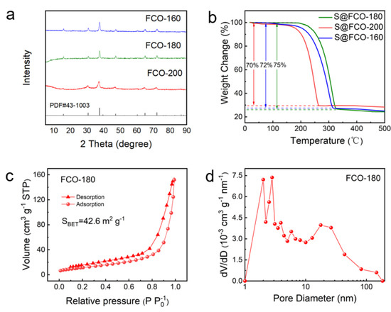 (a) XRD pattern of FCO-180, FCO-160, and FCO-200; (b) The TGA curves of S@FCO-180, S@FCO-160, and S@FCO-200 under N2 atmosphere; (c) The Nitrogen adsorption–desorption isotherms of FCO-180; (d) pore size distribution of FCO-180.