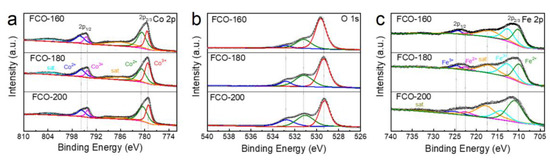 (a) High-resolution XPS spectra of Co 2p in the FCO-160, FCO-180, and FCO-200; (b) O 1s in the FCO-160, FCO-180, and FCO-200; (c) Fe 2p in the FCO-160, FCO-180, and FCO-200, respectively.