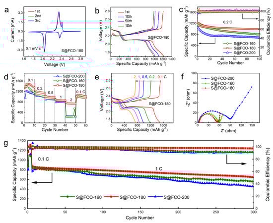 (a) The first three CV curves of S@FCO-180; (b) Charge/discharge profiles of S@FCO-180 at a rate of 0.2 C; (c) The cycling performance of S@FCO-180 at a rate of 0.2 C; (d) Rate capability of S@FCO-160, S@FCO-180, and S@FCO-200; (e) Charge/discharge profiles with S@FCO-180 at different current densities; EIS spectra of S@FCO-160, S@FCO-180, and S@FCO-200 (f); (g) The cycling performance of S@FCO-160, S@FCO-180, and S@FCO-200 at 1 C.