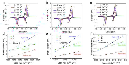 To further explore the diffusion process of lithium ions, cyclic voltammetry is devoted to investigating the conversion kinetics of the LiPSs in the LiS batteries. The diffusion characteristics of Li+ of FCO-160, FCO-180, and FCO-200 electrodes were investigated by CV analysis at scan rates ranging from 0.1 to 0.5 mV S−1 in Figure 6. All LiS cells presented two well-separated reduction peaks, which corresponded to the reduction of elemental S to Li2S via intermediate LiPSs. In addition, the peak positions showed a slight shift with the scan rate increasing. Additionally, the oxidation peak was related to the reverse process, that is, the oxidation of Li2S/Li2S2 to Li2Sx (4 < x < 8) until Li2Sx (4 < x < 8) was completely oxidized to elemental sulfur, thus completing the redox cycle. The lithium-ion diffusion properties were obtained by using the Randles–Sevcik equation: