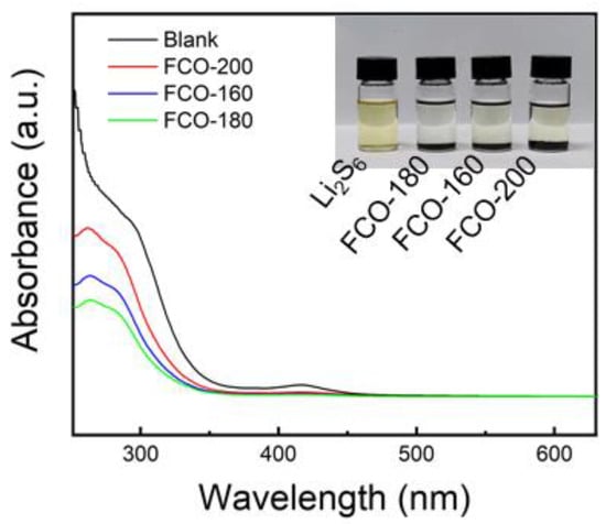 The visualized adsorption ability test of LiPSs and UVvis spectroscopy was conducted to further probe the chemical interaction between different cathode materials (S@FCO-160, S@FCO-180, and S@FCO-200) and LiPSs, using Li2S6 as the representative LiPSs. As displayed in Figure 7, the S@FCO-180 samples completely decolored the Li2S6 solution, whereas the Li2S6 solution containing S@FCO-160 and S@FCO-200 turned colors from yellow to light yellow. In addition, the UV–Vis spectra showed that peaks of Li2S6 were significantly weaker at 262.0 nm when S@FCO-180 hosts were added to the solution. The strong chemisorption between FCO-180 and LiPSs resulted in decreased peak intensities during the tests. These results further confirm the good LiPS adsorption ability of the FCO-180 samples.