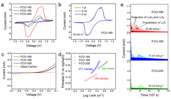 Furthermore, the reaction kinetics of the cells are evaluated based on a linear sweep voltammetry (LSV) measurement. As shown in Figure 8c, the FCO-180 sea urchinlike enabled a more positive onset potential and higher current response for Li2S oxidization compared with those of FCO-160 and FCO-200. Clearly, FCO-180 sea urchinlike presented lower Tafel slopes than FCO-160 and FCO-200 for both the lithiation and delithiation processes in Figure 8d, suggesting that the conversion from short-chain Li2S to long-chain LiPSs was easier and good catalytic performance [31,32].