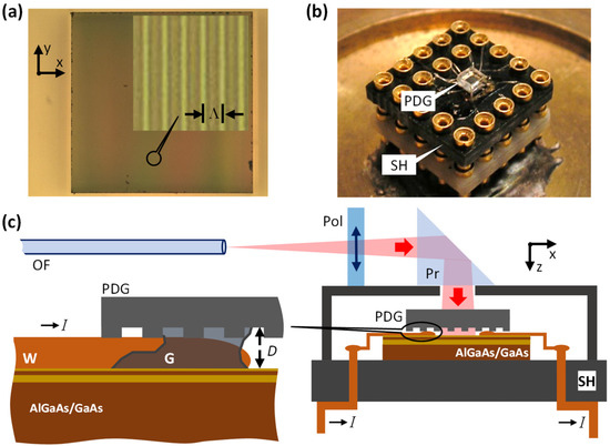 Finally, we would like to emphasize some key advantages of our all-optical PDG technique over the all-optical interferometric technique presented in Refs. [12,13,14,15]. The PDG technique (i) is based on a much more stable, monolithic optical setup (i.e., a single diffractive optical element bonded/glued to a semiconductor sample) featuring a simple initial optical alignment procedure and not requiring any subsequent realignment. Hence, prolonged and/or multistep sample illumination procedures, which can last for days, become possible. Moreover, the PDG technique (ii) utilizes a more compact optical setup (Figure 2b) which can be easily fit into a wide variety of small cryostats (e.g., helium-3 cryostats) using fiber-optics light delivery (Figure 2c); (iii) can use either monochromatic or polychromatic light; (iv) allows one, using one and the same PDG, to double the period of the light pattern by tuning the illumination wavelength.