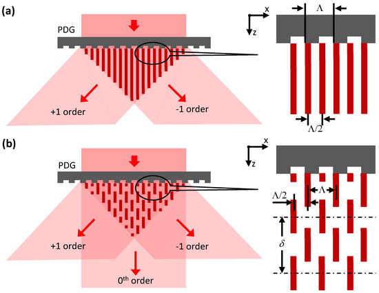 We first consider a situation when the power in the 0th diffraction order is much lower than that in the ±1 diffraction order. In this case, a two-beam interference pattern is formed by the diffracted light behind the PDG (Figure 3a) and, provided that the illumination light is quasi-monochromatic and spatially coherent, the two-beam interference pattern does not change with the distance from the PDG along the z-axis. The period of the interference pattern is given by [21] both for vacuum and any transparent medium.