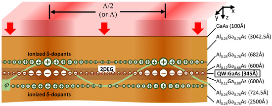 The band gap of bulk AlxGa1-xAs at liquid-helium temperatures is approximately 1.52 eV, 1.67 eV and 1.82 eV for = 0, = 0.12 and = 0.24, respectively [27], whereas the photon energy of the near-infrared (NIR) light with = 780 nm is 1.59 eV. Thus, the NIR light is very weakly attenuated by the 10 nm thick GaAs cap layer and the 35 nm thick GaAs QW but propagates without attenuation in the much thicker Al0.12Ga0.88As and Al0.24Ga0.76As barrier layers. Therefore, the NIR light can reach and ionize donors in the two δ-doping layers lying above and below the QW (Figure 1a and Figure 5). A periodically modulated flux of the NIR photons, realized by the interference of two (Figure 3a) or three (Figure 3b) plane waves at the surface of the Hall bar, will then photoionize the δ-doping donors (i.e., Si-donors [25,26]) and create two subsurface layers with a quasi-sinusoidal distribution of positive charges. We note that the weak absorption within the QW is not expected to play an important role in this process because the photo-generated electron-hole pairs quickly recombine and cannot change the charge state of Si-donors in the δ-doped regions. As a result, the 2DEG in the QW will move under the influence of a periodic electrostatic potential originating from these two layers with immobile positive charges. Following the previous discussion, the period of the subsurface charge distribution can be either or , as indicated in Figure 5.