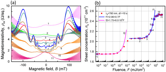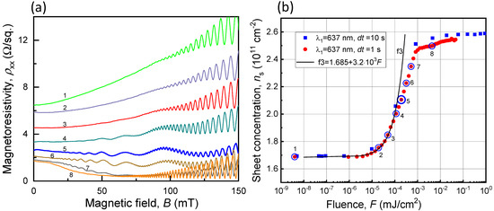 Changes in the magnetoresistivity and electron concentration of the Hall bar illuminated through the PDG using the VIS light with = 637 nm. (a) Traces of magnetoresistivity obtained at different accumulated fluences (see (b)). Traces marked with larger numbers correspond to higher accumulated fluences. (b) Sheet concentration as a function of accumulated fluence . The curve in black (f3) represents a linear fit for the respective electron-generation mechanism described in the text. The trace numbering in (a) corresponds to the data point numbering in (b), with each number representing a certain accumulated fluence. The trace marked by 5 in (a) was chosen for the fitting procedure in Figure 8b.