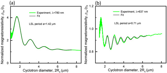 Fitting of the normalized magnetoresistivity ( is the zero-field resistivity) as a function of the cyclotron diameter (, where is the reduced Planck constant). (a) Fitting of trace 6 in Figure 6a; = 2.44 × 1011 cm−2 according to the data point 6 in Figure 6b. (b) Fitting of trace 5 in Figure 7a; = 2.16 × 1011 cm−2 according to the data point 5 in Figure 7b. The fitting curves to deduce the LSL’s period were obtained using the formalism from Ref. [16]. The PDG’s period is equal to 1400 nm.