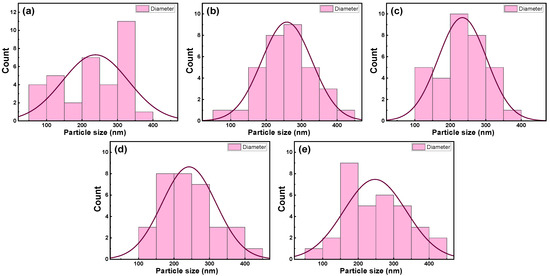 Particles size distribution histogram determined from SEM image of (a) an FTO/glass substrate and TiO2–SiO2 nanocomposite thin films deposited on FTO/glass substrates at (b) 25 °C, (c) 200 °C, (d) 250 °C, and (e) 300 °C.