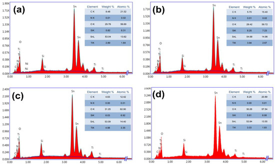 EDX spectra of TiO2–SiO2 nanocomposite thin films deposited at (a) 25 °C, (b) 200 °C, (c) 250 °C, and (d) 300 °C.