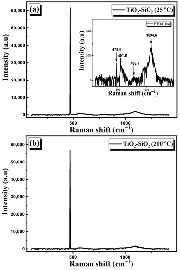 Raman spectra of the PLD-deposited nanocomposite thin films are shown in Figure 7. The first observation is that all the peaks detected in the Raman spectra in the sintered TiO2–SiO2 nanocomposite target (Figure 2a) were absent in the TiO2–SiO2 nanocomposite films. Raman spectra corresponding to the FTO/glass substrate are shown in the inset of Figure 7a. The substrate exhibits peaks at 472.6, 551.8, 786.7, and 1094.6 cm−1. The peak at 472.6 cm−1 can be attributed to the Eg mode in the FTO, which is related to the oxygen vibration in the oxygen plane [33,34]. The peak around 551 cm−1 may be related to the small size effect of the nanoparticles in FTO thin films [34]. Moreover, the peak located at 787 cm−1 can be attributed to B2gs, which is related to the expansion and contraction of Sn–O bonds. Finally, the peak at 1094.6 cm−1 can be attributed to the glass substrate [35]. As can be seen in Figure 7a–d, all samples display the same peaks as the substrate, thus indicating that the deposited thin films of TiO2–SiO2 possess an amorphous structure.