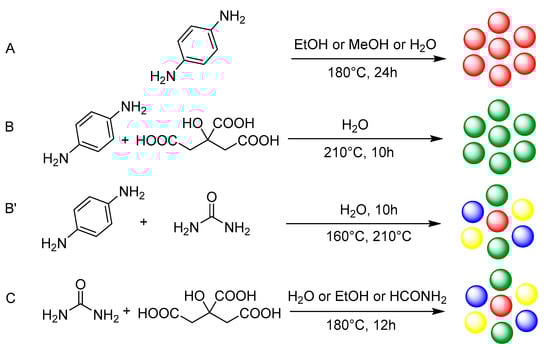 Entry (A): hydrothermal synthesis using p-PDA with different solvents affording red CDs (A); entry (B) and (B′) using p-PDA and citric acid (B) or urea (B′) as co-reagent in H2O, affording CDs mixture not containing (B) or containing (B′) the red component; entry (C) using urea and citric acid in different solvents affording mixtures containing the red component (C).