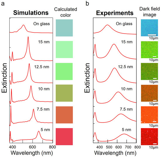 Next, we produced a sample with the LSPR resonance wavelength in the green region by setting the thickness of Al2O3 and Ag thin film to 15 nm and 7 nm, respectively. Figure 3c shows a comparison of the extinction spectrum of the green sample and the spectrum obtained by FDTD calculation. The resonance spectrum showed good agreement between the experimental extinction spectrum and the FDTD results. As shown in Figure 3c, the calculated color from the simulation and the dark-field image were close.