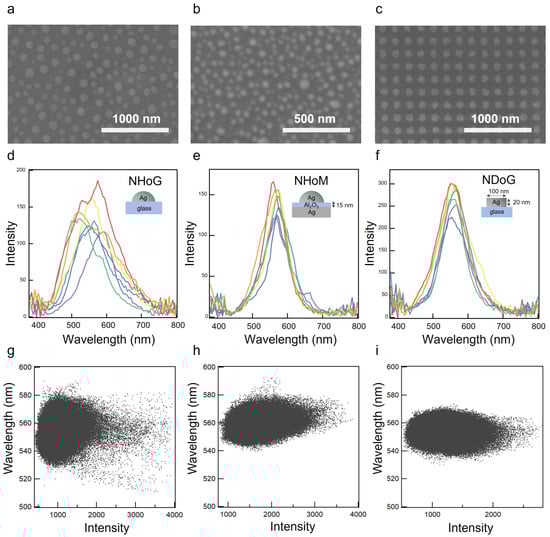 Top view of the SEM image of the nanohemisphere-on-glass (NHoG) structure (a), the NHoM structure (b), and the nano-disk-on-glass (NDoG) structure (c). Dark-field scattering spectra at any seven locations of the NHoG (d), NHoM (e), and NDoG (f) structures using a hyperspectral camera. Fitting results for peak wavelengths and intensities of spectra obtained from hyperspectral images (800 × 600 pixels) of the NHoG (g), NHoM (h), and NDoG (i) structures.