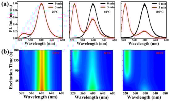 However, CsPbBr1.5I1.5 NCs, which are embedded in the MOF matrix, showed different characteristics between the uncovered samples; Figure 4c,d presents the highly suppressed phase segregation though MOF treatment. Under a continuous excitation intensity (≤1 mW/cm2), it only red-shifted at around 50 nm with a single iodide-rich phase. Moreover, it maintained a constant PL intensity at 1.9 eV and the CsPbBr1.5I1.5/MOF-5 remained stable with no further phase segregation occurring under a period of intense irradiation because the MOF framework limited anion transfer. After a high excitation power Pexc = 5 mW/cm2 of 5 min of illumination, the PL peak showed only ~55 nm shifts and a slow red shift.