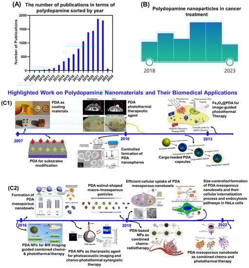 (A) The number of publications in terms of polydopamine sorted by year. Data were collected from the “Web of Science”. The word “polydopamine” is keyed into the “topic” search box (date of search: 5 January 2023). (B) Polydopamine nanoparticles applied in various cancer treatments in last five years (figure produced from PubMed search). (C) A brief timeline for the development of polydopamine in the form of coating materials and nanoparticles of various shapes and sizes, as well as their biomedical applications (C1 (2007–2013) and C2 (2016–2022)) [43,44,46,56,63,73,80,86,87,88].