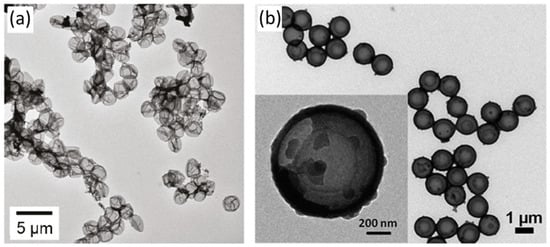 FESEM images, (a) PDA mesoporous nanobowls and (b) PDA walnut-shaped nanoparticles. Reprinted with permission from [44,43], respectively.