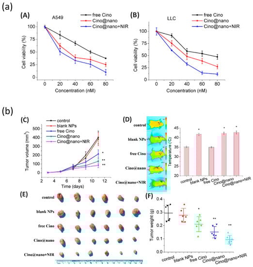 (a) In vitro antitumor efficacy of Cino nanomedicine in lung cancer cells. (A) Viability of A549 cells after incubation with various concentrations of free Cino, Cino-loaded PDA nanomedicine, and Cino-loaded PDA nanomedicine with NIR treatment. Data are presented as mean ± SD (standard deviation, n 4). (B) Viability of LLC cells after incubation with various concentrations of free Cino, Cino-loaded PDA nanomedicine, and PDA nanomedicine with NIR treatment (2 W cm−2, 5 min). Data are presented as the mean ± SD (standard deviation, n 4). (b) In vivo antitumor efficacy of Cino-loaded PDA nanomedicine. (C) Tumor volume growth curves, (D) optothermal response, (E) tumor photo, and (F) tumor weight of LLC tumor-bearing mice after systemic administration of saline, blank NPs, free Cino (1 mg/kg), Cino-loaded PDA nanomedicine (1 mg/kg of Cino), and Cino-loaded PDA nanomedicine (1 mg/kg of Cino) treated with 808 NIR laser (2 W cm−2, 5 min). Data are presented as the mean ± SD (standard deviation, n 6); * p < 0.05, ** p < 0.01. Reprinted with permission from [99].