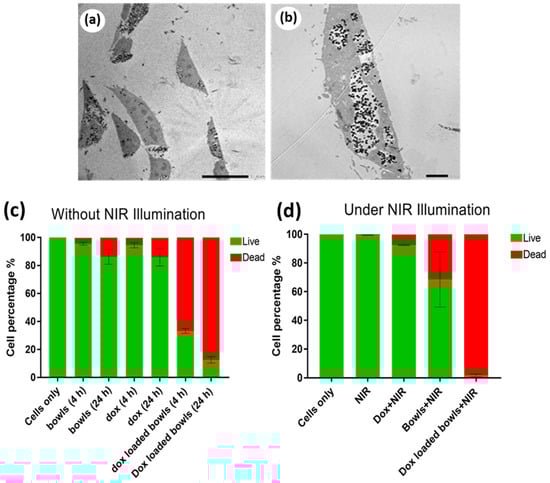 (a,b) TEM images of HeLa cells showing uptake of bowl-shaped polydopamine mesoporous nanoparticles; (b) is the high magnified view. (c,d) showing the impact of various treatments on HeLa cells without and with NIR illumination (1 W cm−2, 5 min), respectively. Green and red bars represent live and dead cells, respectively. Reprinted with permission from [46,63], respectively.