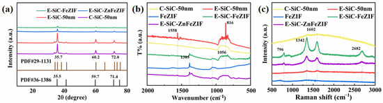 (a) XRD, (b) FTIR, and (c) Raman patterns of the obtained samples, including C-SiC, E-SiC, E-SiC-FeZIF, and E-SiC-ZnFeZIF.