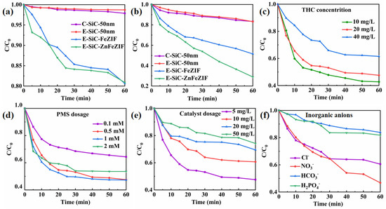 In summary, the E-SiC-ZnFe material supported by ZIF was successfully prepared by doping with Fe, which was first well characterized. Paralleled with C-SiC and ZnZIF, the E-SiC-ZnFeZIF metal matrix composites showed excellent catalytic activity when activating PMS to degrade THC. The catalytic degradation capability of THC is obviously related to the dose of different species (E-SiC-ZnFeZIF, PMS, phosphate ion compound, bicarbonate ion compound, and chloride). SO4− free radicals obviously play a major role in attacking THC. In summary, this study provides a silicon carbide-doped metal matrix composite catalyst for degrading organic compounds in wastewater. In addition, under irradiation from a xenon lamp, the semiconductor photocatalysis material has the ability to reduce carbon dioxide and has a higher yield of methane and carbon monoxide. This material has great potential in addressing energy shortage problems and environmental pollution. Moreover, it sets a precedent for applying third-generation semiconductors (SiC) in advanced oxidation and carbon dioxide reduction.