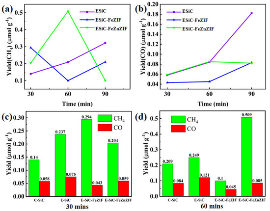 As demonstrated in Figure 7a,b, this experiment was carried out using the liquid-phase method, and the gas in the volumetric flask was collected for testing. In 0.5 h, the carbon dioxide reduction capacity of the E-SiC was stronger than that of the original sample. The yields of CH4 and CO were 1.69 and 1.3 times as much as before. Therefore, in this section, we discuss the selectivity of the reduction products. The selectivity of the etched silicon carbide for methane increased by 6% (to 76.0%) compared to C-SiC. Moreover, after 1 h, the selectivity to methane decreased to 67.3%, and the CH4 and CO yields of the E-SiC were 0.249 and 0.121 μ mmolg−1 h−1, respectively. However, after 1 h, the sample yields of CH4 and CO after etching were higher than that of the original sample. Figure 7c,d show that the CH4 and CO production of FeZIF doped with E-SiC was significantly higher than that of C-SiC within half an hour. After E-SiC was doped with FeZIF and FeZnZIF, the selectivity of the composite sample to CO improved. This shows that the sample had a higher selectivity for CO after being combined with E-SiC. Overall, the addition of Zn reduced the production of CH4 and CO over half an hour, as shown in Figure 7d.