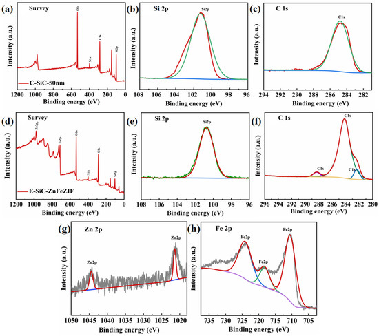 (a) XPS spectra of C-SiC’s survey, (b) Si 2p XPS spectra, (c) C 1s XPS spectra, (d) XPS spectra of E-SiC-ZnFeZIF’s survey, (e) Si 2p signals of E-SiC-ZnFeZIF, (f) C 1s XPS spectra of E-SiC-ZnFeZIF, (g) Zn 2p signals of E-SiC-ZnFeZIF, and (h) Fe 2p signals of E-SiC-ZnFeZIF.