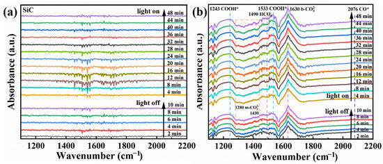 In situ FTIR was performed to study the groups formed on the surface of the E-SiC-ZnFeZIF. This was used to determine the intermediates formed in the CO2 reduction. As shown in Figure 12a,b, in the presence of CO2 and water there are no obvious peaks at 10 min with the light off and 50 min with the light on. This indicates that no obvious intermediates were formed. In the tests of E-SiC-ZnFeZIF, bicarbonate (HCO3*, 1490 cm−1) [51], a CO* active substance (2076 cm−1) [52], carboxylate (COOH*, 1243 and 1533 cm−1) [53], monodentate (m-CO3, 1280 cm−1 and 1430 cm−1) [54], and bidentate carbonate (b-CO3 1630 cm−1) [55] were identified. The peaks of the corresponding intermediates also appear without the xenon lamp on, indicating that E-SiC-ZnFeZIF is sensitive to infrared light sources and can absorb energy from near-infrared light sources, leading to the onset of the CO2 reduction process and the production of the corresponding intermediates.