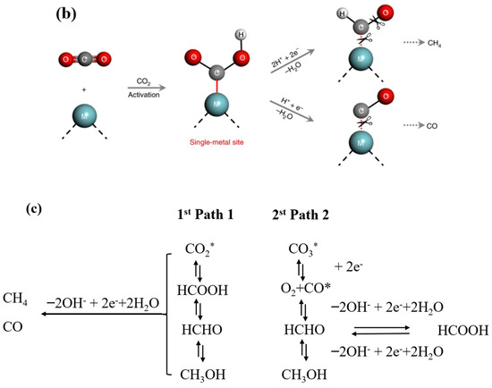 (a) •OH spectra of E-SiC-ZnFeZIF. (b) The mechanism of single metal reduction of carbon dioxide. (c) Scheme of the two possible paths for molecular CO2 and carbonate photoreduction. The symbol * indicates the species adsorbed on the photocatalyst surface. The same routes to the gas phase products (CH4, H2, and CO) also occur for the second path.