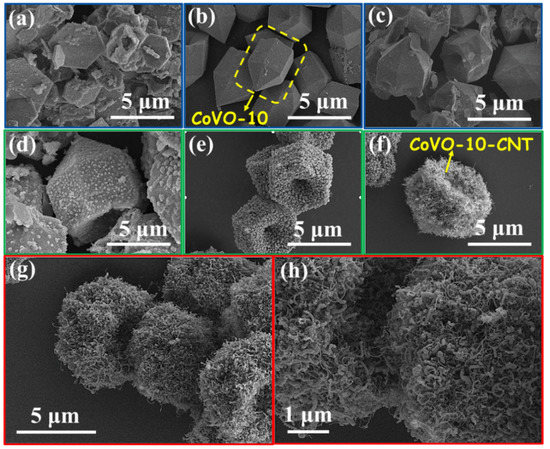(a) SEM images of the calcined CoVO-5, (b) CoVO-10, (c) CoVO-12, and (d–f) CoVO-10-CNT at 600, 700, and 900 °C. (g,h) SEM images of CoVO-10-CNT-450P at different magnifications.