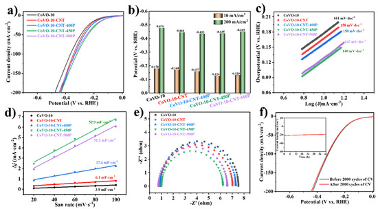 HER performance tested in 1 M KOH electrolyte: (a) LSV curves, (b) overpotentials at 10 and 200 mA cm−2, (c) Tafel curve, (d) ECSA values, and (e) Nyquist curves of different catalysts. (f) Stability test of CoVO-10-CNT-450P.