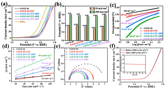 Similarly, the OER performance of CoVO-10-CNT-450P was investigated using the same three-electrode system in 1M KOH. Figure 6a shows the LSV curve of the iR-corrected catalysts. Similarly, the CoVO-10-CNT-450P sample also showed the best OER activity, requiring only 280 and 562 mV to reach current densities of 10 and 200 mA cm−2, respectively. In contrast, CoVO-10, CoVO-10-CNT, CoVO-10-CNT-400P, CoVO-10-CNT-500P, and RuO2, respectively, required 326, 351, 326, 306, and 170 mV to drive a current density of 10 mA cm−2. It is noteworthy that there was almost no difference between the LSV of CoVO-10 and CoVO-10-CNT. This is because the presence of carbon nanotubes on OER activity is negligible, meaning that the excellent OER performance of CoVO-10-CNT-450P originated from the formation of CoP-V4P3 composites after phosphating. Figure 6c shows the Tafel slopes of the catalysts. The Tafel slopes were calculated from the LSV curves to assess the dynamics of the catalyst (Figure 6c). The Tafel slope of CoVO-10-CNT-450P was 80 mV dec−1, which is less than those of other catalysts such as CoVO-10 (309 mV dec−1) and CoVO-10-CNT (207 mV dec−1), indicating that CoVO-10-CNT-450P displayed faster OER kinetics. From Figure 6d, the Cdl values of CoVO-10, CoVO-10-CNT, CoVO-10, CoVO-10-CNT-450P, and CoVO-10-CNT-500P were 30.2, 22.0, 56.4, 75.8, and 89.2 mF·cm−2, respectively. Relatively speaking, CoVO-10-CNT-450P observably had the largest Cdl, indicating an obvious advantage over the other catalysts in terms of active surface area and active site.