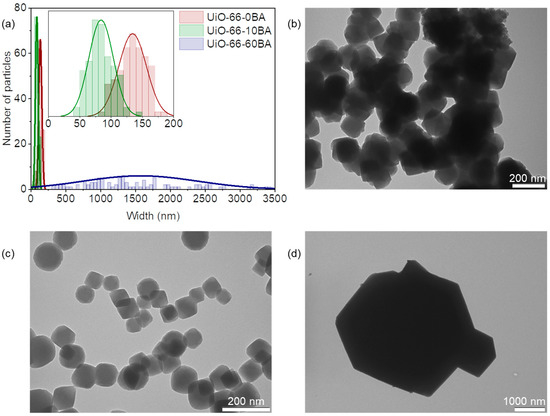 (a) Particle size distribution of UiO-66 samples according to TEM data (the inset shows the magnified part corresponding to data for UiO-66-0BA and UiO-66-10BA samples). Representative TEM images of UiO-66-0BA (b), UiO-66-10BA (c), and UiO-66-60BA (d) samples.