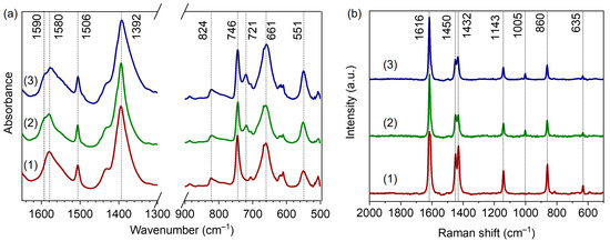 Selected regions of IR (a) and Raman (b) spectra of UiO-66-0BA (1), UiO-66-10BA (2), and UiO-66-60BA (3) samples.