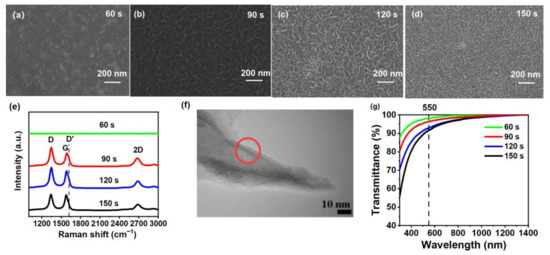 Figure 3g displays the transmittance spectra of GNWs grown on clean quartz substrates with varying growth times from 60 to 150 s. As observed in Figure 3g, the transmittance of GNWs gradually decreases with an increase in the growth time. For example, the transmittance of GNWs at an incident wavelength of 550 nm, denoted as T550, is 96.4% for a growth time of 90 s and 91.5% for a growth time of 150 s. Table 1 presents the electrical and optical properties of GNWs grown for 90, 120, and 150 s. One can notice that the carrier concentration, mobility, and conductivity increase, while the sheet resistance decreases with an increase in the growth time. Specifically, as the growth time increases from 90 to 150 s, the sheet resistance of GNWs decreases from 254.3 to 123.5 Ω/sq., while the mobility, conductivity, and carrier concentration increase from 1.08 cm2V−1s−1, 0.131 Ω−1cm−1, 1.18 × 1016 cm−3 to 2.62 cm2V−1s−1, 0.270 Ω−1cm−1, and 6.42 × 1017 cm−3, respectively. The electrical properties of GNWs grown for 150 s are superior to those of the other two samples due to a large amount of interconnected graphene. However, the T550 for GNWs grown for 150 s is lower than the other two samples. The properties of GNWs grown for 120 s achieve a compromise between sheet resistance and transmittance.