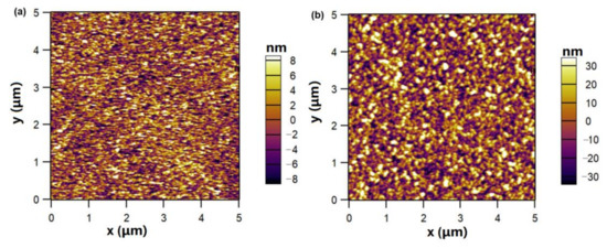 Figure 4 shows the AFM images of GNWs grown on the Si substrate with different growth times of 90 s (a) and 120 s (b), respectively. From Figure 4, one can notice that the growth time can affect the surface roughness of GNWs. The root mean square (RMS) roughness of the GNWs with a growth time of 90 s is about 4.231 nm, while the RMS roughness of the GNWs with a growth time of 120 s is about 16.890 nm. The edges of GNWs are significantly larger with a longer growth time, which makes the surface rougher.