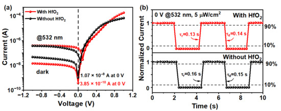 where Iph is the photocurrent generated under light illumination, which is calculated by subtracting the current measured in the dark from the current measured under light illumination (Ilight–Idark); A is the active area of the device (A is in our work), and P is the power density of the incident light (P is in our work). The calculated responsivity of the device without HfO2 is about 0.058 A/W, and the calculated responsivity of the device with HfO2 is about 0.19 A/W.