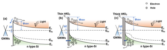 From the above analysis, one can notice that in comparison with the photodetector without HfO2, the GNWs/HfO2/Si photodetector has a lower dark current, a higher PDCR, and a faster response time. To explain the underlying physical mechanism behind this phenomenon, the energy band diagrams for the GNWs/Si and GNWs/HfO2/Si photodetectors are shown in Figure 7. Without a HfO2 interfacial layer, photo-generated electrons of Si can easily move toward GNWs through thermal emission because of the low built-in potential between GNWs and Si, as shown in Figure 7a. Then, the unwanted recombination occurs immediately as the short lifetime of the carriers in the GNWs [46], giving rise to the poor performance of the GNWs/Si photodetector. The existence of a HfO2 interfacial layer modifies the band alignment, resulting in a band bending in the valence band of Si and an increased Schottky barrier height in the interface, as shown in Figure 7b. When a thin HfO2 interfacial layer is introduced, the movement of the photo-generated electrons from Si toward GNWs would be significantly blocked by the increased (the Schottky barrier height), while photo-generated holes can tunnel through HfO2 due to its higher probability of tunneling (after the introduction of a HfO2 interfacial layer, the barrier height for photogenerated electrons is significantly higher than that of photogenerated holes, leading to a higher probability of photogenerated holes than photogenerated electrons). Therefore, the recombination of the carriers in GNWs can be suppressed effectively [15,42,47,48], leading to the excellent performance of the GNWs/HfO2/Si photodetector. However, if the thickness of HfO2 is too thick, the tunneling probability of holes through HfO2 decreases, and therefore, holes accumulate at the interface. This will result in a higher recombination rate of photo-generated carriers and deteriorate the performance of the GNWs/HfO2/Si photodetector. At this time, the quasi-Fermi level for holes in the silicon shows obvious bending due to the accumulation of the holes, as shown in Figure 7c. Our experimental result demonstrates that the optimal thickness of HfO2 is 3 nm in our work, which will be presented later.