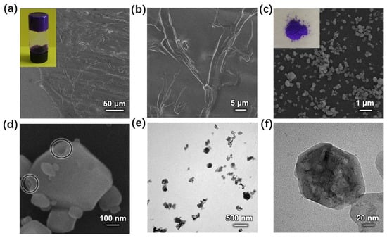 (a,b) SEM images of gel film coated on a silicon wafer (inset: the photograph of ZIF-67 LMWG); (c,d) low and high magnification SEM images of HP-ZIF67-G particles (inset: the photograph of HP-ZIF67-G); (e,f) corresponding TEM images of HP-ZIF67-G particles.