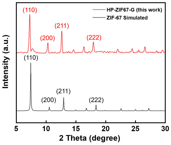 Figure 1c shows SEM images of the obtained HP-ZIF67-G nanoparticles from the ZIF-67 gel. It is revealed that the diameter of nanoparticles was in the range of 200–500 nm. In the enlarged SEM image (Figure 1d), the pores can be clearly seen on the surface of the HP-ZIF67-G nanoparticles. Figure 1e,f shows the corresponding TEM images of the HP-ZIF67-G nanoparticles. As can be clearly seen, there are a lot of mesopores inside the particles. The hierarchical porous structure denotes nanoparticles with a large specific surface area which could be beneficial to their electrochemical properties. Figure 2 illustrates the X-ray diffraction (XRD) pattern of the ZIF-67 nanoparticles prepared by high concentration reaction. It exhibits several sharp peaks that match the simulated XRD pattern of ZIF-67 (CCDC number: 671074) [15]. Some residual peaks in the XRD pattern of the HP-ZIF67-G nanoparticle can be seen, which may be due to phase impurities arising from lattice dislocation caused by the coordination of trimethylamine and cobalt ions. However, the XRD spectra exhibit a clear consistency between the primary diffraction peaks of HP-ZIF67-G and the simulated XRD patterns of ZIF-67, indicating the material’s robust crystalline structure despite the extensive distribution of hierarchical pores within the sample.