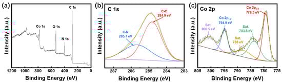 (a) XPS survey spectrum of HP-ZIF67-G; (b) corresponding core-level fine XPS spectra for C 1s, (c) corresponding core-level fine XPS spectra for Co 2p.