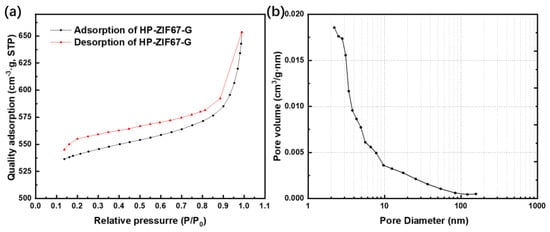 (a) N2 adsorption–desorption isotherm curves of HP-ZIF67-G; (b) corresponding pore–size distribution of HP-ZIF67-G.