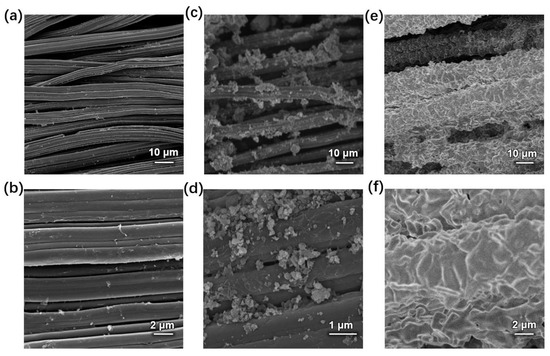 Low- and high-magnification SEM images of (a,b) blank carbon cloth, (c,d) HP-ZIF67-G on the carbon cloth, and (e,f) HP-ZIF67-G and PANI on the carbon cloth, respectively.