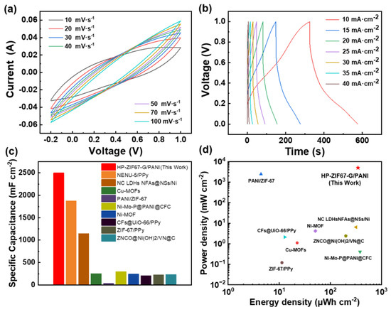 (a) CV curves of the HP-ZIF67-G/PANI/CC symmetric device with PVA-H2SO4 gel electrolyte; (b) GCD curves of the HP-ZIF67-G/PANI/CC symmetric device with PVA-H2SO4 gel electrolyte; (c) specific capacitance of the solid-state supercapacitor−based HP-ZIF67-G and other reported electrode materials; (d) Ragone plots of HP-ZIF67-G and the listed materials [36,37,38,39,40,41,42,43].