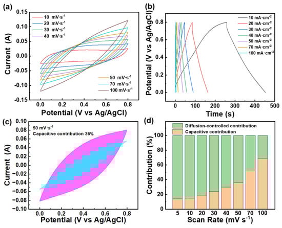 (a) CV curves of HP-ZIF67-G/PANI/CC in a 1.0 mol L−1 KCl aqueous solution electrolyte; (b) GCD curves of HP-ZIF67-G/PANI/CC in a 1.0 mol L−1 KCl aqueous solution electrolyte. (c) Capacitance contribution of the HP-ZIF67-G/PANI/CC electrode in KCl aqueous solution electrolyte at 50 mV s−1, for detailed data refer to Figure S8; (d) capacitance contribution ratio between surface capacitive process and the diffusion–controlled process at different scan rates.