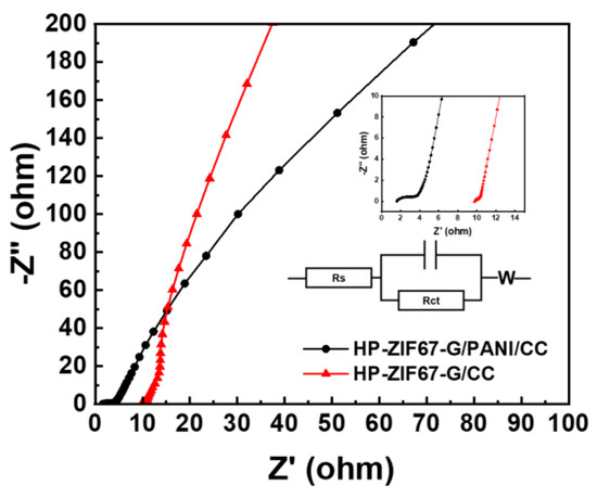 Nyquist electrochemical impedance spectrum of HP-ZIF67-G/PANI/CC and HP-ZIF67-G/CC.